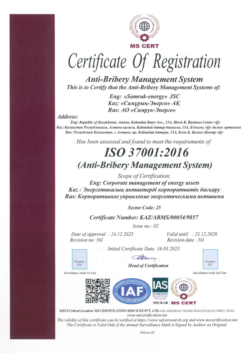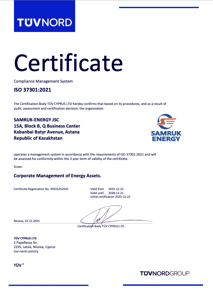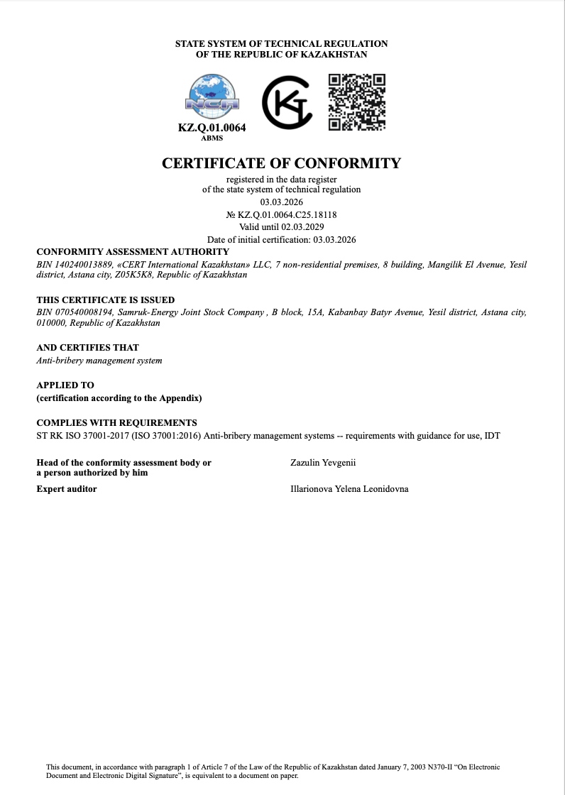 A successful and sustainable company is built on trust. For shareholders, investors, and partners, it is essential that the company conducts its business with honesty, transparency, and accountability. In this regard, JSC «Samruk-Energy» carries out its activities in line with international best compliance practices, placing special emphasis on anti-corruption efforts and adherence to the principles of fair business conduct.