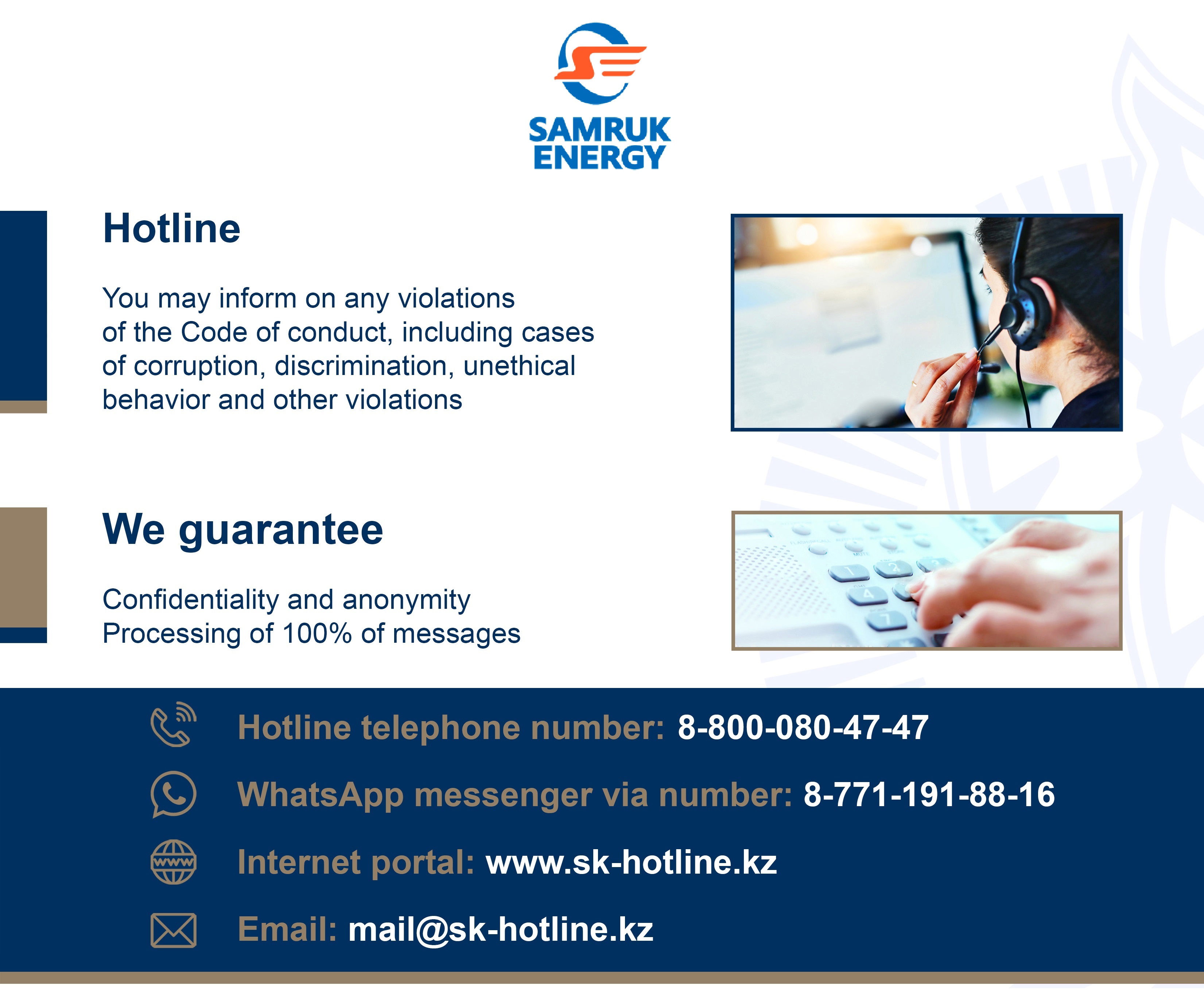 Samruk-Kazyna JSC (hereinafter – the Company) pays special attention to the development and maintenance of a corporate culture that demonstrates commitment to the principles of integrity, transparency and honesty. In order to further maintain a positive image, Samruk-Kazyna JSC is pleased to announce the launch of a Hotline for timely detection and prevention of violations of legislation and/or the Code of Conduct, including cases of fraud, corruption, discrimination, unethical behavior and other violations related to the Company’s activities.