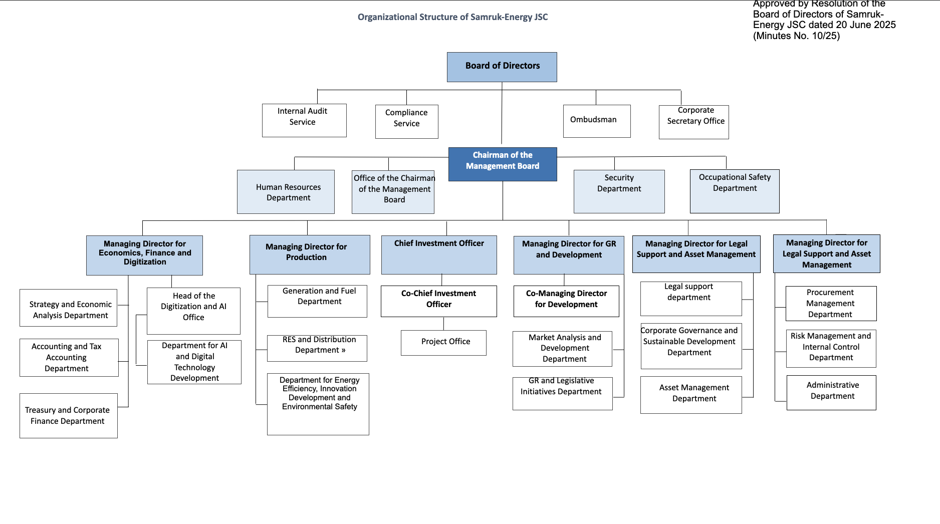 Environmental protection is fully embedded in the Company’s corporate governance structure. The senior executive team is accountable for the implementation of the Company’s environmental commitments, targets, and performance indicators. The Board of Directors is responsible for approving the environmental strategy and associated policies. Day-to-day oversight of environmental initiatives is carried out by the Department for Energy Efficiency, Innovation Development and Environmental Safety of Samruk-Energy JSC. Within the Group’s subsidiaries, dedicated environmental units are in place to implement corporate policies and strategies, and to ensure that contractors and business partners comply with the Company’s environmental standards.