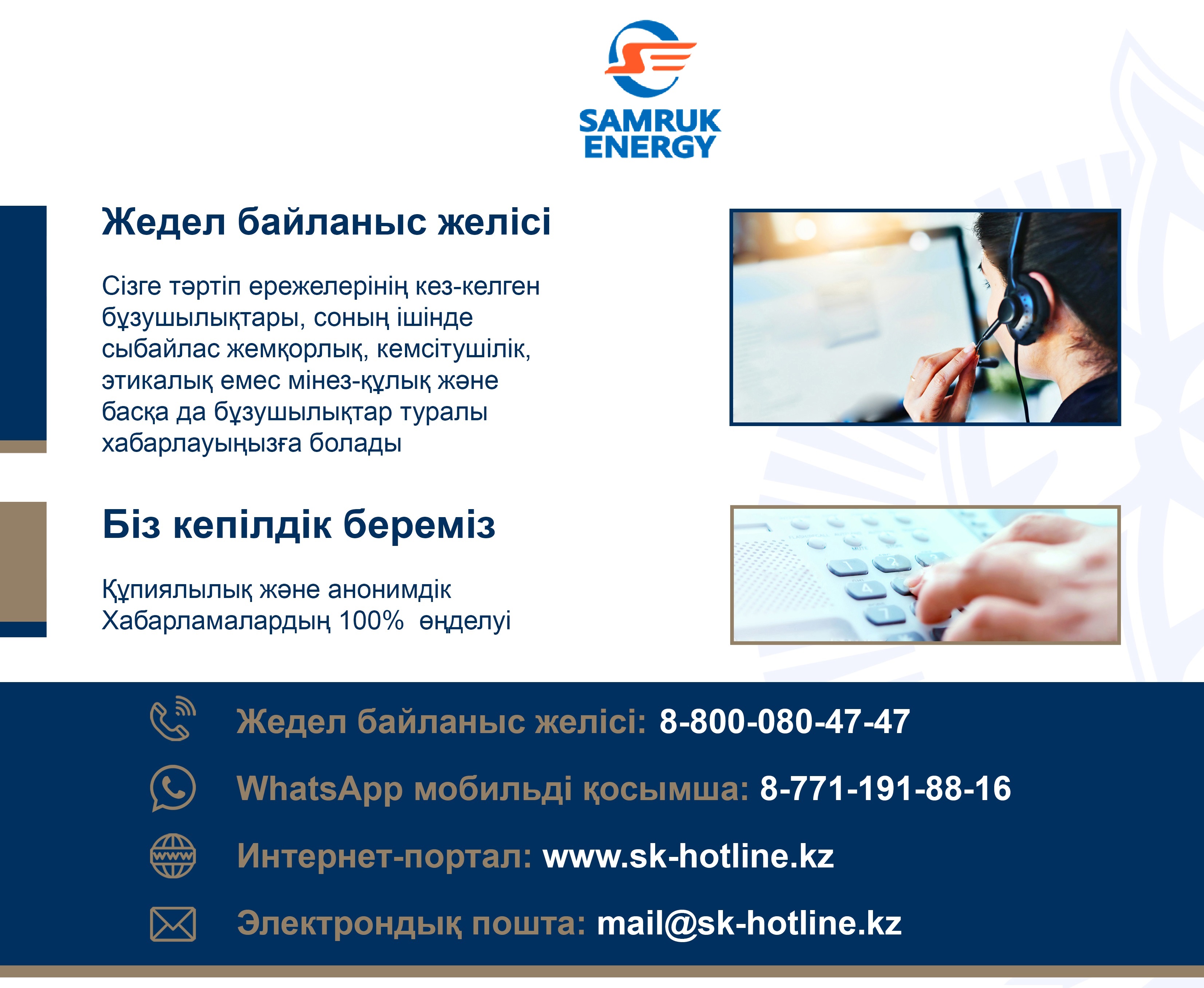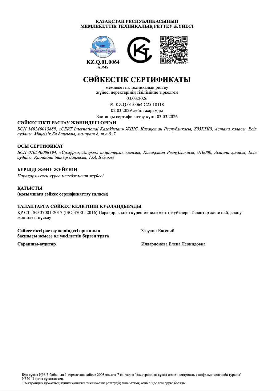 «Самұрық-Энерго» АҚ «Жедел желі» – заңды және/немесе Әдеп кодексін күдікті бұзушылықтар, алаяқтық, сыбайлас жемқорлық, құпия және инсайдерлік ақпаратты рұқсатсыз жария ету жағдайлары туралы хабарлауға арналған арна екенін хабарлайды. Өнімдер мен қызметтерге қатысты сұрақтар бойынша, сондай-ақ «Самұрық-Энерго» АҚ және оның еншілес және тәуелді ұйымдарының басшылығына ресми сауалдар алу үшін тұтынушыларды қолдау қызметтерін және компаниялардың корпоративтік веб-сайттарында берілген байланыс ақпаратын пайдаланыңыз. Тапсырыс берушінің, ұйымдастырушының, конкурстық комиссияның, сараптамалық комиссияның немесе «Самұрық-Қазына» тобы компанияларының электрондық сатып алу ақпараттық жүйесінің операторының әрекеттері мен шешімдеріне шағымдар Қазақстан Республикасының заңнамасына сәйкес zakup.sk.kz сатып алу веб-порталы арқылы берілуі тиіс.