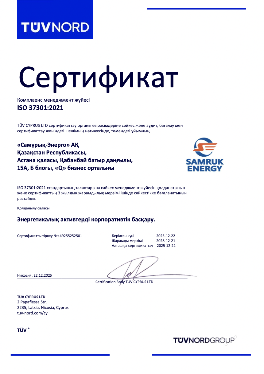 Табысты және орнықты компания сенімге негізделеді. Акционерлер, инвесторлар мен серіктестер үшін компанияның адал, ашық және жауапты бизнес жүргізуі маңызды. Осыған байланысты «Самұрық-Энерго» АҚ өз қызметін халықаралық үздік комплаенс-тәжірибелерге сәйкес жүзеге асырады, сыбайлас жемқорлыққа қарсы іс-қимылға және адал іскерлік қағидаттарды сақтауға ерекше мән береді.
