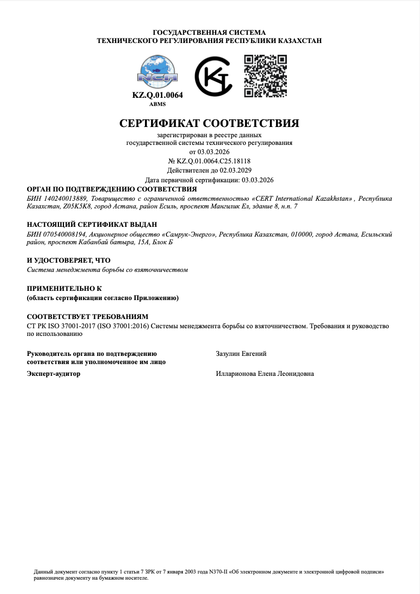 Успешная и устойчивая компания строится на доверии. Для акционеров, инвесторов и партнеров важно, чтобы компания вела честный, прозрачный и ответственный бизнес. Именно поэтому АО «Самрук-Энерго» реализует свою деятельность в соответствии с лучшими международными комплаенс-практиками, уделяя особое внимание вопросам противодействия коррупции и соблюдению принципов добросовестного ведения бизнеса.