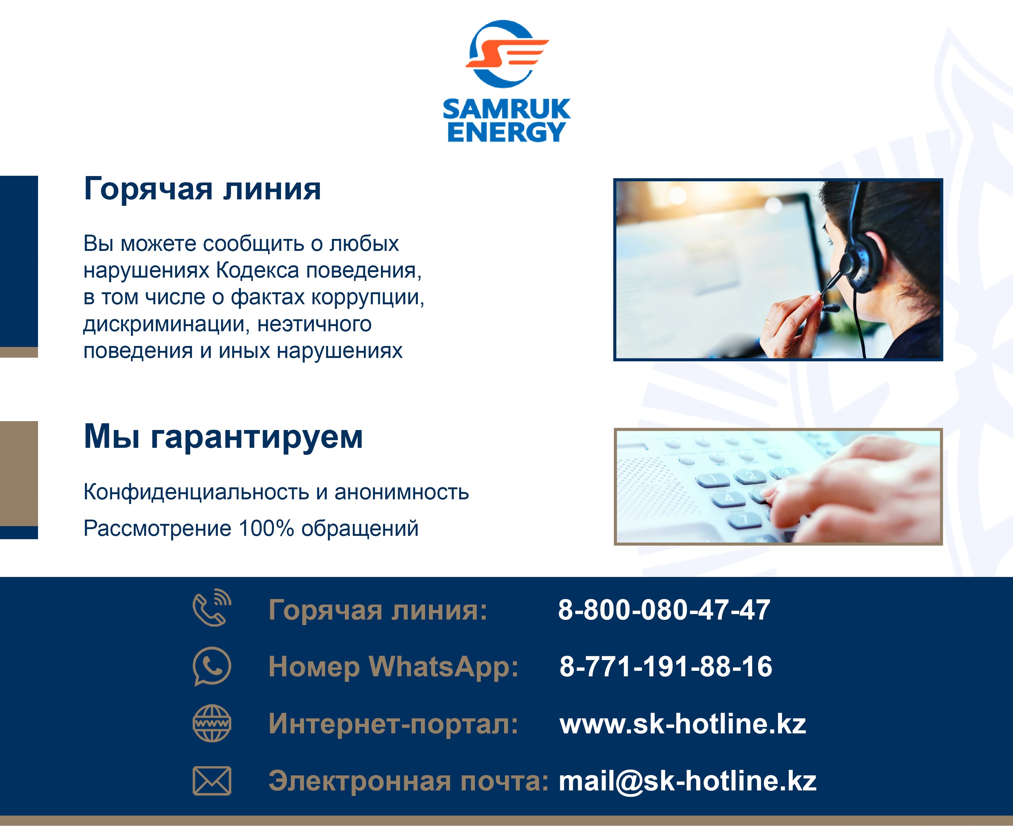 АО «Самрук-Энерго» сообщает, что Горячая линия является каналом информирования о предполагаемых нарушениях законодательства и/или Кодекса поведения, случаях мошенничества, коррупции, несанкционированного разглашения конфиденциальной и инсайдерской информации. По вопросам, связанным с продуктами и услугами, а также для официального обращения к руководству АО «Самрук-Энерго» и дочерних и зависимых компаний следует использовать службы поддержки клиентов и контакты, указанные на корпоративных сайтах компаний. Жалобы на действия и решения заказчика, организатора, конкурсной комиссии, экспертной комиссии, оператора информационной системы электронных закупок компаний группы АО «Самрук-Казына» следует подавать через веб-портал закупок zakup.sk.kz в соответствии с законодательством Республики Казахстан.