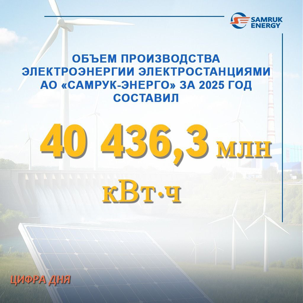 По итогам января–декабря 2025 года совокупный объем выработки электроэнергии дочерними предприятиями АО «Самрук-Энерго» по оперативным данным составил 40,4 млрд кВтч. Этот показатель на 2% превышает уровень 2024 года и является наивысшим за последние 20 лет.
