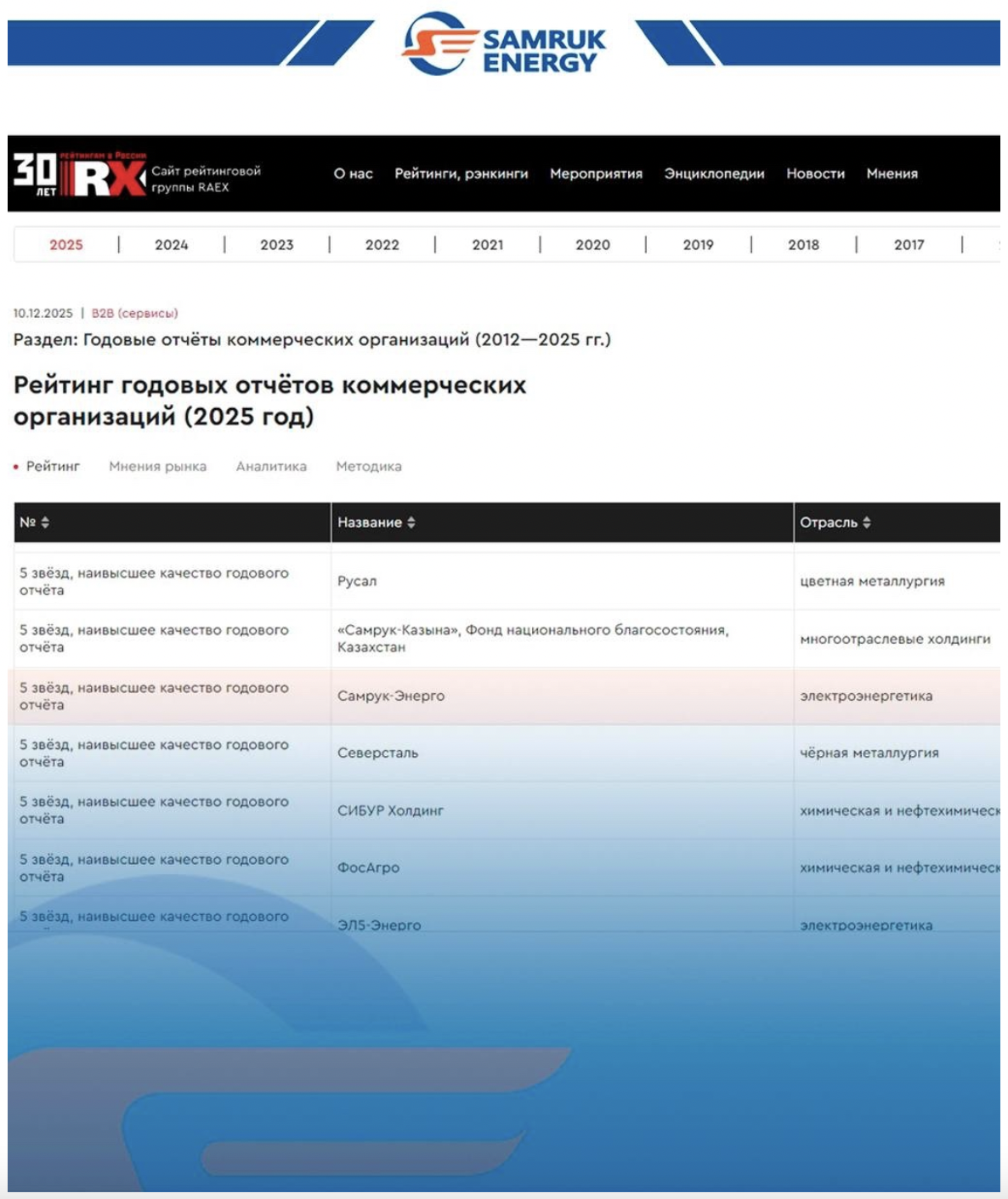 АО «Самрук-Энерго» получило наивысшую оценку — 5 звёзд в Рейтинге годовых отчётов коммерческих организаций 2025 года, опубликованном международным рейтинговым агентством RAEX.